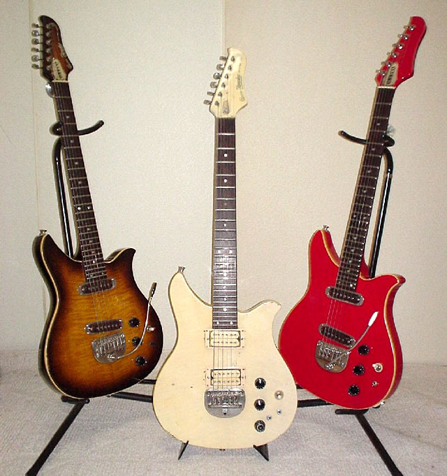 投稿いただいたのは、なんとBW600が3本並んだ集合写真。右側の「レッド」はリフィニッシュのため製造番号は不明。ブロンド(中央)は「J78」、タバコサンバースト(左側)は「L78」。ブロンドは2ハム(JACK JONES)にピックアップ交換されてトレブリーなサウンドが特徴。タバコサンバーストのシカモア・トップが「吊り目」なのも目を引くポイントだ。「レッド」に取り付けられているのはフェンダー・ジャガー用アーム。ブローラーは生産数も少なく、このようなショットには滅多にお目にかかれないだろう。「レッド」は新品並に状態が良く音は元気で太い。「サンバースト」はかなり使い込んでるので、ちょっと渋みが増した音とのこと。いずれにしてもシングル・コイルP.U.としては音が太いという。 |