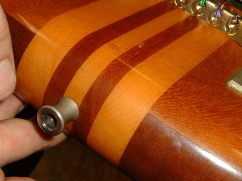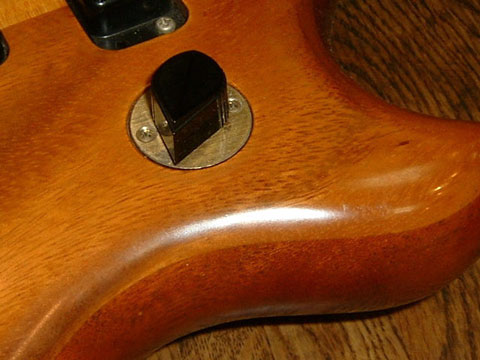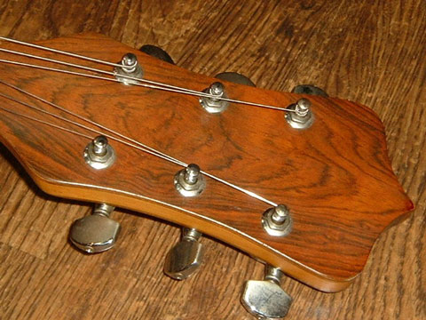 SagaさんのFAGは明かに特注品。最初のオーナーは関西方面のプロ・ギタリストだったとのこと。指板が良質なエボニーであるほか、ヘッド表裏の突き板はハカランダ、ボディ・トップ&バックはハワイアン・コアだろうか? Sagaさんから今回ご指摘いただいたのだが、他ページにある回路の解説には問題があった。当時のカタログから引用すると「ホーンタイプステレオアウトプットジャック:ホーンタイプのプラグを使用することの出来るステレオアウトプッジャック。このアウトプットはステレオになっているので、シールドコードはステレオタイプを使用してください。もし、モノラルコードを使用した場合、フロントP.U.のみしか音が出ません。また、このジャックを使用した場合は内蔵のバッテリーでプリアンプが作動します」となっている。Sagaさんご自身は、ステレオ−モノラル変換のアダプタを使っているとのことだ。 なお画像のギターでは、コントロール・ノブはアレンビック・タイプに交換され、テールピース位置を5ミリほど後退させるアレンジが施されている。 |