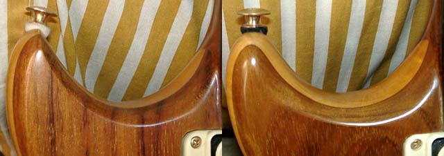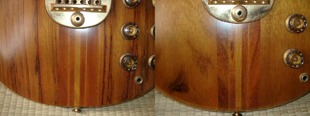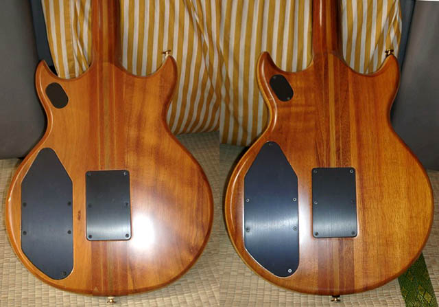 | バックはともにコアのようです。パネルは金属製。右がJのバック。こちらも同じ仕様です。フィニッシュはナチュラルのつや消しなのですが、頻繁に触る部分はつやがでています。ネックの裏やひじの当たる部分はピカピカです。 |