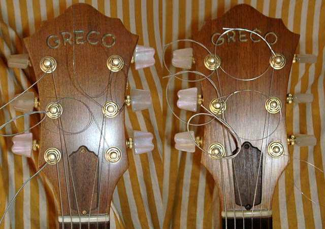 | Kシリアルのヘッド(左)。一般的なGOlll1800仕様ですが、ロッドカバーのネジはゴールドカラー。Jシリアル(右)は黒です。イバニーズのパーロイドペグはボタンわきにトルク調整リングがついています。ナットもボディ側にブラスがラミネートされた凝った構成になっています。ロッドカバーに使われた木の材質は、Jシリアルの色が濃く質感がやや異なります。ロッドカバーは2プライになっていて、下側が色の白い部分はブラスで作られています。 |