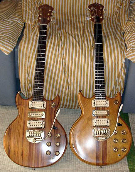 GO1000は19,800円、そしてGOlll1800はなんと、23,800円! これは買うしかない! どうせ買うなら高い方だ!、と息を荒げたのですがGOlllは一本しかありません。「じゃあ、僕は安い方にするよ。」と兄に言ったのですが、取りあえず店員さんに聞いてみよう、ということで確認すると在庫があるではないですか。「すみません、二本ください」という兄の声。私は持ち合わせがなかったので兄にカードで払ってもらいました。店員さんが在庫の品を持ってきてレジに向かうと、「お〜、金持ち〜」という他の客の声が聞こえました。金額はたいしたことなかったのですが、いきなり衝動買いで二本もギター買っていく客はそう見えたのでしょうか? もう嬉しくて、帰りはワクワクでした。帰宅してケースをあけると、センターピックアップのブラスリングが錆びていました。永年倉庫に眠っていたので仕方ありませんが、兄のものはまともでした。そして、「あ〜、新品なのに錆びている!ぼろねじ〜!」とばかにされることになったのでした。しかしサンドイッチされたメープルには綺麗なトラが出ていました。兄のはプレーン。「へんっだ、俺のはトラがバリバリだもんね〜っだ」「ぼろねじ〜、ぼろねじ〜」。そばで見ていた母は「あら、本当に錆びてるわね。ぼろねじだ。良く見て買わないからよ・・・」と結局私の負けでした(^^); 「だって在庫をわざわざ出してもらったんだよ!」と言ってはみても無駄でした。今はもう母も他界してしまいましたが、当時を思い出させる 懐かしのギターです。兄のはフルオリのミントですが、 私のは一時メインで使用していたため、かなりいじってあります。回路系はプッシュプルのポットに交換しタップとフェイズ切り替え可、GR-1をつけていたため、取り付けネジ穴が残っています。安い買い物だったのであまり大事にされていませんでした。今考えると勿体無いですね。