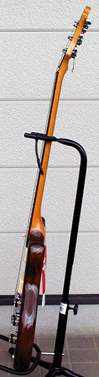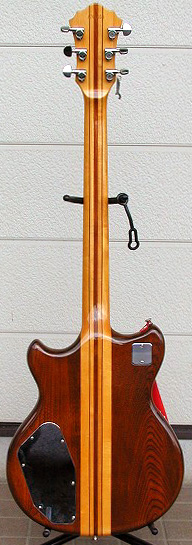 | GOでさらに初期の個体が発見された。これは地方のスペシャル・エージェント店に2003年まで在庫されていた新品扱いのギター。ブラックのヘッド・フェイス、ブラスナットという初期型の特徴に加え、ヘッド裏面のモデル名入り金属プレートがないのが目立つ。またダークステイン仕上げの塗装にも関わらず、金色のコントロール・ノブが取り付けられている。Vol.9カタログ掲載機では、ノブとボディ色の組み合わせに明確な規則性を見出せない。「GOの戸籍簿」から、ナチュラルのアクティブ・コントロール付きは「黒ノブ」と確認出来るので、この部分にあまり拘りがなかったのかもしれない。アジャスター・カバーが逆さまに取り付けられているのは、再装着時の間違いだろう。2つのミニSWに劣化があったため、販売店の手によって部品交換がされている。 |
