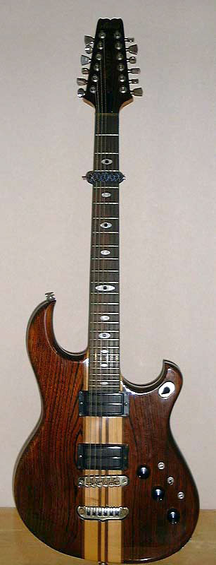 たしか、81〜84年の頃に入手したものです。 横浜帝都無線のアリアのカタログでみつけ、シングルネックの12弦が珍しかったので、取り寄せを依頼しました。メーカーにも在庫が無かったとのことで、その後、しばらく時間がかかりました。カタログ価格8万円、2割引でソフトケース付きでした。 スルーネックで、おそらく真ん中がメープル、次にマホ、メープルでボディとの間が、またマホで、ボディはセンだと思います。スルーネックでも、いくつもの木を張り合わせたネックだと狂いが少ないとか。実際、厚みは2cm程度しかない薄いネックなのですが、買ってから一度もネックの調整をしたことがありません。 弦は0.09〜0.42をベースに、オクターブ上の弦は、G弦を0.08、D弦からは0.09のセットの1,2,3弦を張り、全体を1音下げてチューニングしています。 アルペジオで弾くとさすが12弦、綺麗です。コーラスとリバーブをかけると、12弦の天然コーラス効果と、エフェクタのコーラス効果で、もう「天国」です。 |