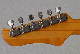 製造番号「D79」は1979年4月期に出荷されたギター。GOll前期の標準的な特色を全て備えている。この後アームホルダーの頭部が半球状になり、さらにバックパネルがブラックに変更されていく。アジャスタ・カバーが銀色で焦げ茶色のペイント文字なのも標準的な仕様。ごく一時期のギターだけに金色でエッチング状加工の部品が使われたようだ。