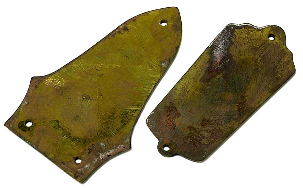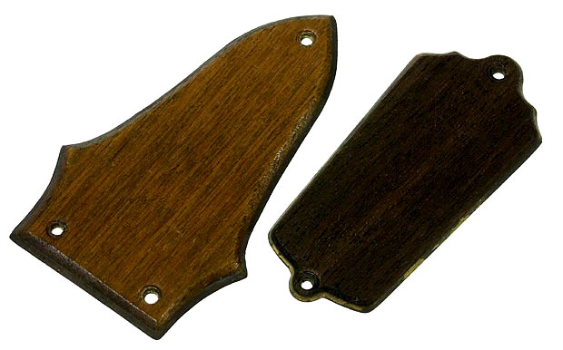 左はGOll950(ウォルナット・トップ)、右はGOlll1800(ハワイアンコア・トップ)のもの。表面木部の質感はボディとかなり異なる。ブラスと張り合わされ2層構造だが、表面処理をされてないため、外観として露出する金属断面はすっかり茶色になり、木部と殆ど馴染んでしまっている。裏面のブラスには手作りと見られる粗さを感じる。GO系列後期の「最上級機」に用意された部品だが、これを好まず交換してしまった個体もしばしば見かける。GOll用にも金色のアジャスタ・カバーがあったが、950グレードには採用されず、他機種に規則性無く使われた印象だ。GOlll1800プロトでは、この部品にも「Speed way」の文字がみてとれる。(GOll用は金属製とネジ穴位置が違うのでご注意を・・・) |