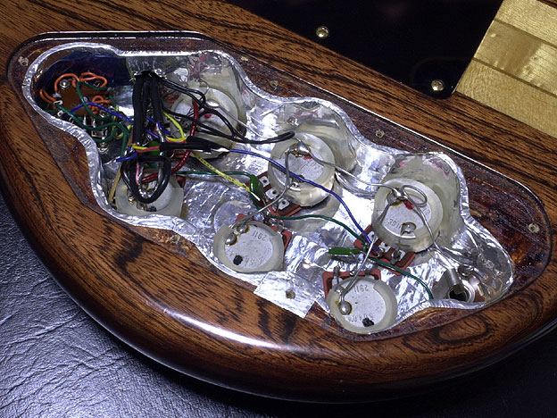 | 紹介文などでGOlll発表以前のギターを「GO型」として切り離しているが、キャビティにも初期型または過渡期型の特徴が多くみられる。別項にあるGOlll1800の同部分と比較していただきたい。「F79」という製造番号を持つこの個体では、まだまだ細部の詰めに問題が残されている。ポット本体にラバーをかけた結果キャビティにつかえてしまった部分、アース端子がカバーの「穴」に届かないなどは未成熟だ。これは後々、キャビティや端子の形状変更で解決されている。ロータリーSWはトップのアーチから影響を受け傾斜して取り付けざるをえず、ホット側の配線がシールドに触れないように青い絶縁テープを挟み込む対策が見られる(GOlllではトップに落とし込みの面取りが行われた)。ロータリーSWとフロント・コントロールの間には5Pのラグがあり、ピックアップとロータリーSWの結線を橋渡ししている(端子2つはラグの固定に使われている)。周辺で配線がやや長めなので、この部分を最後にハンダ付けし狭い部分での作業を避けたと窺える。マスターVOLを持たないにも関わらず6本の線がP.U.キャビティに向かうのは、それぞれのP.U.がシールド・プレートを持つのでアース用の線があるため。 |