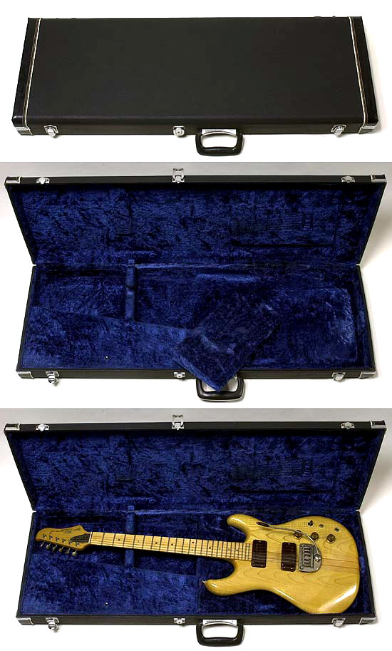 GOll専用ハードケースはVol.10カタログに角形のものが紹介されている。画像のケースは入手時に「A78」のGOll750DSTが納められていたものだ。初代オーナーから「専用ケースを指定した」と聞いたほか、まさにジャスト・フィットなので、ほぼ確実にこれが専用ケースだろう。断面が三角形の「枕」が付属するので1000円高いらしい。もちろん全体に、アングル付きのヘッドを無理なく収納できる設計だ。小物入れの引き手は残念ながら千切れてしまっている。外観にGrecoのブランド・ネームもなく、他に流用されてしまったものも多いことだろう。 |