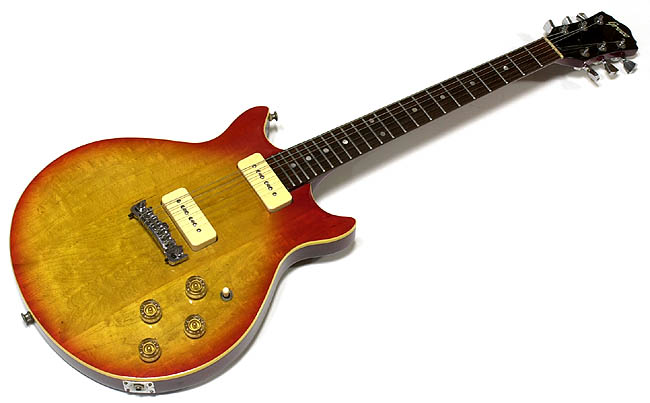 MR600(F77) MR600は1977年からシリーズに追加された機種で前後期の別がない。通巻番号カタログには8月のVol.9から登場する。その中ではマホガニー単板バックと紹介されているが、これは何かの間違いだろう。画像のギターは2層4枚の板を合わせた合板構造だ。メイプルの削り出しトップは3ピース、ネックはメイプル3ピース22フレットでローズ指板。ピックアップはPU−104、ブリッジはBR2020(以前のBR202)、ペグはMH802が採用された。MRは現在眺めても非常に美しいデザインだ。左右対称シェイプのギターでは最上級に美しいはずだが、これには少なからず「秘密」がある。ボディ・シェイプが独特の物で、座って弾こうとするとギターが右側に落ちようとする。右脚に乗せて演奏する姿勢ではあまりにも不安定だ。一方、ストラップ使用で立って弾こうとすると、著しくヘッド・ヘビーなバランスを発揮する(とくに24フレットのもの)。ルックスの美しさと引き替えに、非常に辛い癖を身につけてしまった。これはグレコも察知するところで、ストラップ・ピンがネック付け根から6弦側ホーン先に変更されたり、後発のMXは根本的に問題を解決しようとした設計だと考えられる。重量は3.8kg(弦を含む)。グレコのP−90系ピックアップのギターはどの時代でも大変魅力的だ。ぜひ試してみて欲しい。 |