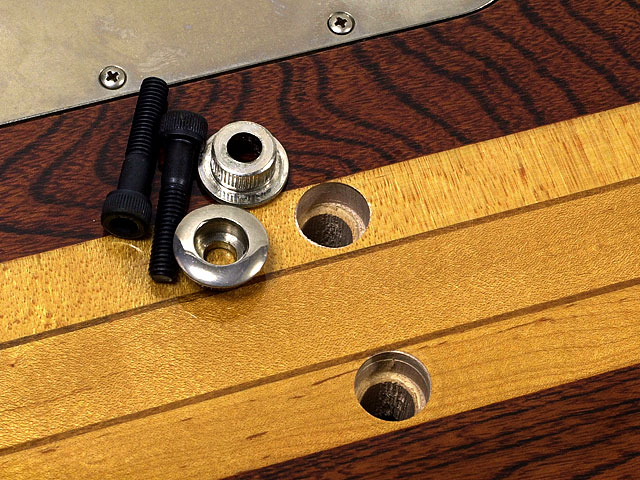 | 取り付けボルト用にはボディ背面から段付き穴が開けられ、大型のブッシュがあてがわれる。T.S.ビブラートは営業上の理由から急遽採用されたと考えられる面が強く、トレモロ・キャビティでスルーネックを切ってしまうのは、当時としては異例に大胆な発想だった。今日ではスルーネック/フロイド・ローズ・トレモロは当たり前の組み合わせとなったが、主流になり得なかった「ケーラー」や「アンサー・シフト2001」などの方が、構造としては好ましかったと感じる向きも少なくあるまい。テンション・アジャスター・ブリッジのGOllを弾くと、ビブラート搭載機より遙かに力強く鳴ってくれると即座に気がつくはずだ。 |