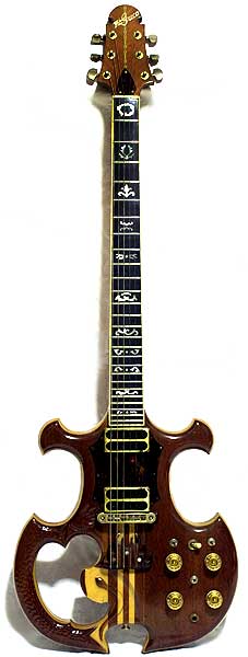 このギターは1975年10月の楽器フェアに陳列されていたもの。このときの企画で、38の特約店からそれぞれにショップ・オーダーモデルの出展があったうち、新潟の「あぽろん」さん分とされたギターだ。実際の製作はさらに古く、神田商会側からお店サイドに推薦があったという経緯がある。ギター購入時に付属した「HAND BOOK(1970年代後半)」や、1977年のTHE GRECO MANUALにも、やはりオーダーメイド・ギターのサンプルとして紹介されていた。1977年の時点で19万円の参考価格があるほか、VOl.8〜9カタログには、製作中の様子が写真掲載されていたのでご覧になった方も多いだろう。細部については「あぽろん」さんのサイトを参考にしていただきたい(「Greco 珍品」で検索可能)。付け加えるならば、ピックアップ・カバーの構造は「金属と黒い素材」とが象嵌状に仕上げられている点。さらに、3つのミニSWのうち2つがタップ、残りがアウトプットのON/OFFスイッチになっていること、フェンダー系のいわゆるロングスケールが採用されていることだろう。GOシリーズの基礎となった物として、小川銀次さんのアレンビック型ギター(1977年2月発注、8月完成)があげられることが多い。しかしGO発表(同年10月)の時期を考えると、些かの無理がある。「あぽろん」にはプロトと言うより「習作」の気配を感じるが、スルーネックの研究は古くから行われており、プロジェクト・シリーズのポール・マッカートニー・ベース(PMB)や小川氏のギターを皮切りに製品化されたと考えるのが自然だろう。話しは前後するが、1975年楽器フェア出展オーダー・ギター・サンプルにミラージュ型のモデル(2本・イバニーズ#2663のグレコ版)があったのは興味深い。また、差異が見いだしにくいモデル(ファイヤーバードIや1964年型のフライングVのコピー)もあるが、一種異様なデザインが多い「同期」のギター達の消息が気になる。僅かにイシバシ楽器さんの「ミュージック・シーカー君ギター」、トミヤさんの「女体ギター(私が保有)」、国際楽器さんの「バットマン・ギター」などの所在が分かっているだけだ。これはと思うギターをお持ちの方には、是非連絡を頂きたく望んでいる。