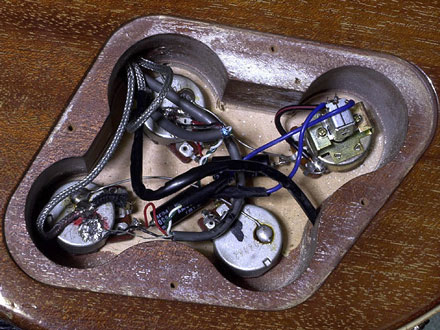 このギターはオーダーメードによる製作で、その証拠としてリア・ピックアップ・キャビティに「ORDER MADE」のスタンプが入れられています。私が入手したとき既に改造があり、ギブソン・ハムバッカー(HB−R/HB−T)を搭載していました。木部の掘削やネック・ジョイントについては、1985年当時の標準型と判断しています。画像ではフロント・トーンのノブを使ってプッシュ/プッシュで同時タップとなっていますが現在は回路をシンプルな構成に戻し、ベストマッチのピックアップを模索中です。