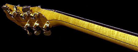 6弦側の1枚はかなりの杢を見せる。3本ともこの様子だったら、さぞゴージャスだったことだろう。ここでも材は任意に選定されたようで、シンメトリーなマッチングは考慮されていない。