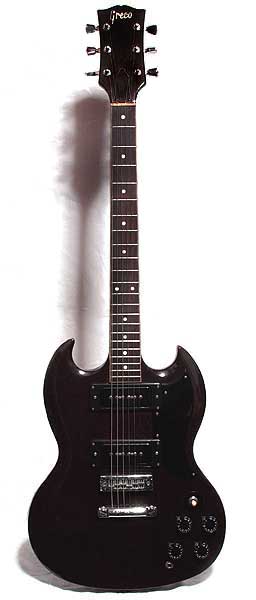 ソープバー・タイプのピックアップをエスカッションでマウントしたギターは、本家ギブソンで一般的な構造ではない。従って国産コピー群の中に見かけることが殆どないだろう。もちろんグレコでも、画像のようなギターは他にない。しかもこのエスカッションは、ミニハムバッカー用とサイズが全く異なる。エスカッションのようなプラスチック部品を作るのには「金型」が必要で、これは決して安価なものではない。ワンオフのギター用に製作していては不合理があまりにも大きい。そこで同じピックアップ型式を当時の資料に探すと、1970〜71年の海外向けカタログに掲載されたIbanez No.2377がある。これは1970年ごろから本家で盛んに企画された「新しいSG」のコピーらしく、黒いプラスチック製のレスポール風ピックガードと単独のコントロールパネルを持つほか、ビグスビー式トレモロやドットポジションの特徴がある。ピックアップは1973年のパーツカタログにも収録され、No.2377-60と紹介されている。1970年代前半においては、富士弦が生産するギターで国内販売用は神田商会が扱う「Greco」、輸出用が星野楽器扱いの「ibanez」の住み分けがあったが、モデル・ラインナップについては「Ibanez」の方がずっと多彩だった。1975年までのIbanezはコピーモデルばかりで、中にはグレコと殆ど同一のギターもあったが、この時代ではヘッドにブランド・ロゴの無いギターが多い。1975年途中にアーティスト系列の始祖に当たるモデルやアイスマンが登場し、1976年には全モデルがオリジナルデザインのヘッドを採用、1976年にオリジナルモデルが大量投入され、1977年になるとコピーモデルは姿を消して行く。海外では1975年ごろからコピーモデルに対し圧力がかかり始めたのが手に取るように分かる。ギブソン型ヘッドのギターを輸出しないとの方針は、1975年の内に急遽決定されたようだ。この時点で生産途中のギターが相当にあったのではないだろうか? この年のグレコには、それまでの路線と大きく異なるギターが突如多機種登場する。SG500(SG Jr.タイプ)、TV500(レスポール Jr.タイプ)、MG600(メロディーメーカー・タイプ)、LJ600(レスポール SPL.タイプ)などの廉価版モデル(しかし割高か?)が目立つほか、EG550BD(ノーバインディングでブラック&ゴールドのレスポール型)などが挙げられる。当時、これらのギターについて国内需要があったとは考えにくい。またグレコのカタログモデルでも、この年を中心に短期間だけ使われたロゴ(輪っか付き「r」)が目立つ。EG550BDについては「The Greco」ロゴの個体も市場に出回った。グネコ(Gneco)ロゴは、商標登録を機会に「Greco」のスラント・ロゴに変わって行ったが、ほぼ同時期に「輪っか」タイプが存在し、こちらは印刷物に全く使用されなかったことに注目したい。さらに問題のギターはペグ裏や指板エンドに「☆マーク」が入っている物が多い。私見となるがこれらは、輸出できなかったIbanezの化粧直しなのだろう。ヘッドのブランドロゴは元々インレイ(象嵌)ではなく「置き貝」なのでロゴの変更は容易だし、元よりロゴ無しであった可能性が高い。区別のために臨時のロゴを作ったのか、作業が通常のライン外で行われたと想像してしまう。1972年に復活したギブソンSGスペシャルは、ワイドトラベルブリッジ、黒塗装のミニハム、ドット・ポジションの仕様であった。画像のギターはレフトオーバー・パーツを利用して、この路線を狙ったものではないかと感じている。ボディは4層の合板、ネックは塗色が濃く(シースルーのダークブラウン)材質が分かりにくいが3ピースのマホガニーに見える。指板はローズでマーカーはプラスチック。重量は弦も含んで3.6kgだ。