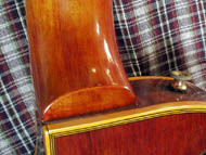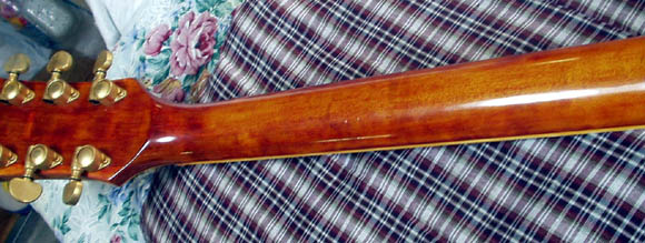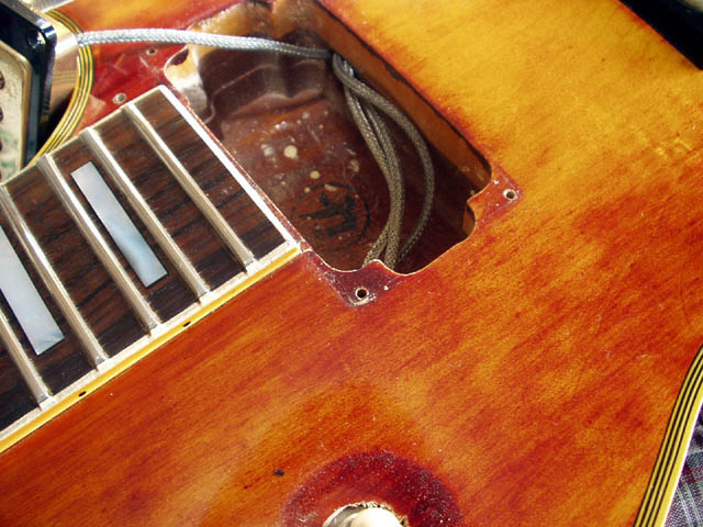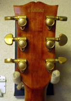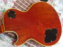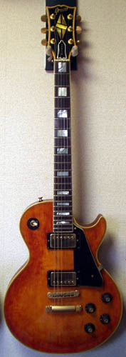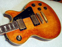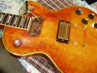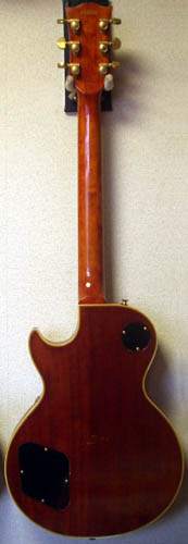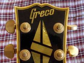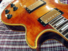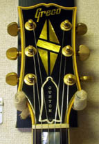 カーリーメイプル2ピーストップ、マホガニー2層合板バック、メイプル3ピースネック、縞エボニー指板、ピックアップU4000、グローバーペグ、ヴァイオリン仕上げ、重量4.6kg。 1977年、グレコギターの中では最高価格の15万円だったEG1500はその当時楽器店のショーケースにギブソンと一緒に展示され、その価格から買えるはずもない学生達(私)は試奏さえも断られ、触る事すら許してもらえなかったモデルである。 買えない悔しさもあって「何が、ニスの手塗りだ! 家具じゃあるまいし」と思っていたのだが、事実当時の色は駄菓子屋の麩菓子色であり、誰がこの20年後の退色を予想しこの色合いを想像出来ただろうか? EG1200同様に各パーツの下には元の色が確認出来、ピックガードの下にも元の色が形通りに残っている。 ヘッドの突き板部分ではクリアの日焼けが進み、太文字のGrecoロゴやスプリットダイアモンドが金色に輝き美しい。 '77年までのメイプル3ピースネックは非常に細く(薄く)1フレットと2フレットの中間での値は「厚さ20mm」「幅44.5mm」「周囲111mm」で11フレットと12フレットの中間でも「厚さ23mm」でこの値は別項の'76年EG900、'77年EG1200も共通である。 '78年からは、ネックも若干太くなり、'79年には材質がメイプルからマホガニーの3ピースに移行し、材質の変更に伴いネックシェイプも太く変わって行く。 指板はカタログではエボニーとあるが、実際はプロジェクトシリーズEGモデルではハカランダと間違えるような上質な縞エボニーを柾目採りで使用しており、レギュラーラインとの格差をつけている。 フロントピックアップキャビティー内にはEG1200同様に○の中に[力]のスタンプがあるが、当サイトオーナーの狛江のグレコマニア氏からは「神田商会の[力]かも?」の説があり、国産嫌いの友人は「カスタムショップの[力]」と推理している・・・。 最後にレギュラーラインとプロジェクトラインEGモデルの一番の違いはなにか? それはネックの接合部にある! レギュラーラインのネックヒール部には接ぎ板が使用され、メイプル3ピースネックも実際は4ピースになっておりピックアップキャビティーから接着面を見ると隙間がある機種も存在する。 この接ぎ板工法はEGモデルに限らず他のグレコセットネックモデルでも採用されているが、他社にも同様な工法が見られる。 剛性の為では無くコスト的に有利な接ぎ板工法は'79年迄続き、'80年のスーパーリアル期からは廉価版のEG500でさえも接ぎ板は使用されなくなった(初期物には混在する)。 しかし'82年のミントコレクション期のディープジョイント以降のモデルで接ぎ板工法は復活してしまうのである。 プロジェクトラインEGモデルでは接ぎ板の使用は無く、ボディー/ネック/指板がキッチリと隙間なく接着されている。 今回EG1350は私の趣向で無い為に手放してしまいレポート出来ないが、プロジェクトシリーズEGモデルは何れも本当に良く出来たギターである。 |