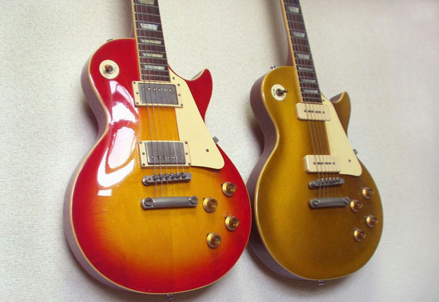 「グレコ・スーパーリアルシリーズ」(おやじレポート by グレコおやじ) ヘッドにSuperRealの金文字が入るスーパーリアルシリーズのレスポールコピーは、従来のEGモデルへ新たにEGFモデルを追加した。 まず'79年後期にEGF850を発表し、その後'80年に入ってからEGF1000そしてEGF1800を発売、その後'80年中期にはEGF1200がさらに加わった。 スーパーリアルシリーズ発表後'80年初期までは、EGFモデル以外にも全てのEGモデルのヘッドにSuperRealの金文字が入ったが、その後価格帯のランク付けの為かスーパーパワー、スーパーサウンドの名称が加わり、後にスーパーリアルはEG800以上のモデルのみに使用された。 従来のモデルからスーパーリアルへの変更は一気に行われた訳では無く、備蓄木材や旧パーツを序々に消化し、その後スーパーリアル用の木材、パーツに移行されている。 この移行期間の過渡期モデルは'79年製のEGF850に多く見られ、シリアルNoもEGFモデルながら旧スタイルのK79****、L79****の物が存在し、インクスタンプによる9 ****スタイルも製作されている。 '80年に入ってからもヘッド、ネック、ジョイント、ボディー、木材他、各パーツ等がめまぐるしく変更、改良されて行くので「'80年式はこうだ」「'81年式はこれが正解」など答えは無いが、各年式前期、後期の特徴は見分けられる(後日レポート)。 一般的にEGFと言えば850/1000/1200/1800がカタログや雑誌広告で紹介されているが、その他にもEGF1300/1500/2100/2500/リミテッドエディションEGF1600/2500等がショップオーダーとして販売されていた。 その特徴は「1300=850/1000にギブソン製P.U.を搭載した物」「1500=1800のトップで杢が弱く、PUカバーが無くオープンになっている物」「2100=1800にギブソン製P.U.を搭載した物」「2500=キルト系の上質なトップ」「リミテッドエディションEGF1600='80年('79年)にギブソン社で3本作られたリミテッドディションのコピーモデルでトップがラミネイト」「リミテッド・エディションEGF2500=リミテッド・エディションのコピーモデルで、トップがソリッドのほかネックにトラ杢材を使用」である。 さて、今回はスーパーリアルシリーズEG/EGFモデルのボディーカラーをレポートしたい。 カタログではサンバースト系カラーはレッドサンバースト、サンバースト、タバコサンバースト、サンバーストレディーがEGFに用意されているが、この4色も実際のモデルではかなりの変化を見せている。 レッドサンバースト一つを見ても色彩やグラデーションは同一では無く、ギターによっても塗料の吹き方が違うようだ。 特にEGF1200のみに採用されているサンバーストレディーと言う不可解な名称はフェイドしたサンバーストカラーをイメージしたのだが、レモンドロップ、ハニーサンバースト、アイスティーサンバーストと呼べる色々な個体が存在したので画像で確認頂ければ幸いである。 EGF1200の画像で1本だけ見かけない色があるが、これはカラーオーダー物の為に異種であり、レギュラーラインのEGF1200には存在しない。 EGF1800の画像にも1本ブラウン系に見える個体が有るが、これはカラーオーダーでは無く、このロットでEGF1800のカラーは濃いレッドサンバーストが作成されている。 ボディーバックのカラーは「ブラウン系にはブラウン、レッド系にはレッド」とトップと同色系が吹かれているが、EGF1200のイエロー系にはピンクバックが通常採用されている他、EGF2500のブラウン系トップのバックは薄い琥珀色となっている。 多彩なEG/EGFカラーだが「この機種にはこの色は存在しない」等と言う事は無く、このレポート以外にも多数のカラーが存在するに違いない。 次回は移行して行く各パーツ、ボディー形状をレポートしたい。