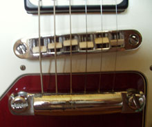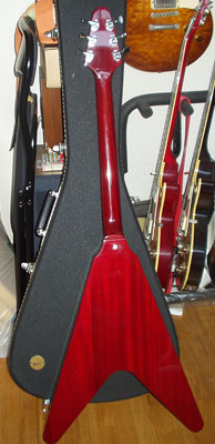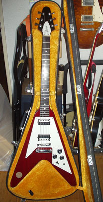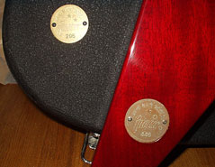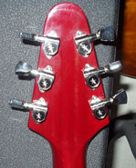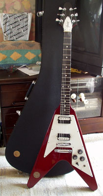 マホガニー1ピースセットネック、マホガニー2層合板ボディ(トップ側とバック側で合計4ピース)、エボニー指板、ナイロンサドル・ブリッジ、ペグは★マークのイバニーズ共有品。重量は3.5kg。 約30年前のフライングVメダリオンのコピーモデルである。 グレコの'70年代初期モデルは、ヘッドロゴのr(アール)がn(エヌ)に見えるため俗に「グネコ」と呼ばれ、本機でもグネコロゴのロッドカバーが付いている。 グネコ時代の各種コピーモデルは色々な面でまだまだ開発途中だったが、このFV900のコピー度はかなりの物だ。 価格もレスポールコピーのハイエンドモデルが8万円なのに対し、構造上レスポールモデルより単純なこのモデルが9万円とは驚かされる。 ボディーエンドに貼られたメダルには「ハンドメイドモデル」とあるが、事実その作りは非常に丁寧かつ繊細で、とてもグネコ時代の物とは思えない程のクォリティーを持っている。 各パーツの貧弱さはその時代からしてやむを得ないが、本物を参照したと思えるナイロンサドルはサウンド的にかなり重要な部分ではないだろうか? アンプ直のサウンドは、アンガス・ヤング、トニー・アイオミ等のマホガニー系の音が素直に出てくる。 30年過ぎた今でもネック、指板の狂いは皆無、ネックジョイントにも異常は無くアンプ直で勝負出来る素晴らしい1本である。 注)ケースはオリジナルだが、メダルについては別途入手した物を貼った。グレコ製メダリオンケースは純正では存在しない。 |