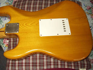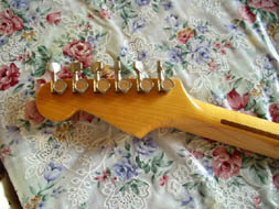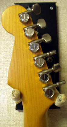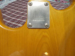 グレコ・オリジナルMH803ペグ、ハードロック・メイプル1ピースネック、セン1ピース・ボディー、ピックアップ・ディマジオ社ファットストラト×3、カシュー塗装、重量3.5kg。(→1978年モデルとの比較 ) 1979年、グレコ・コピーモデルは色々な面で変わって行くのだが、このSE1200も改良された点がかなりある。 外観からは、ピックガードの素材が変わったのだろうか? 裏側にシリアルの入ったオリジナル・ピックガードなのだが、'78年製と違い今現在も白いままである。 ボディーカラーはナチュラルで以前レポートしたSE1000と同じカラーなのだが、塗料がラッカーからカシューに変わったせいか色彩・質感は相当に違う。 ヘッドは1弦側ナット付近アール部の面取りがされ、かなり丸みを帯びている。 ネック・グリップ形状もV型になり、段があったヒール部は段付きを無くし他社を大分意識した作りになった。 内部はネック側ジョイント部にアルファベットの[T?]らしき赤色のスタンプが押してあり、ボディー側ネックポケットには〇の中に[林]の印がある。 個人名の捺印は他にも[渡部][中林]を他機種で確認しているが、次回レポート予定のEG1200・1500にある〇に[カ]の文字も個人名なのだろうか? ボディー・ザグリには他のプロジェクトシリーズ同様に金属板でシールドが施されているのだが、今回はその下に文字等の記載は無かった。(→分解内部) '77年から'79年のプロジェクトシリーズSEモデル4機種をレポートしたが、この時代の上位モデルはコピー度云々より、いかに手作業で丁寧に仕上げているかをアピールしており全てにマツモク製ギターの温もりを感じる。 |