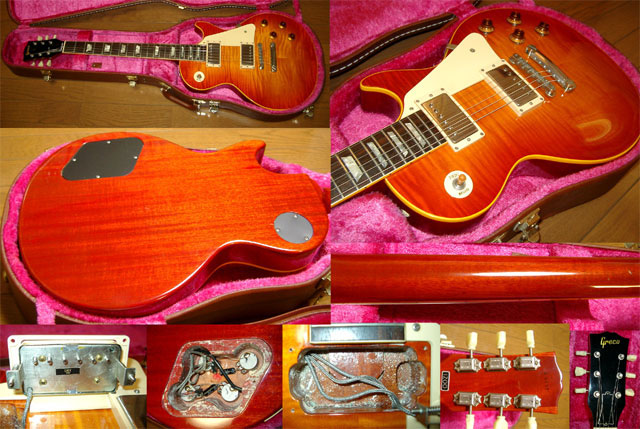 1983年のEG58−120、製造番号「3 40××」です。私は2nd. オーナーで、ミントシリーズになった後のものです。バック1ピース、トップはキャビ内の塗装はありませんが、そのブックマッチの見事さからラミネートと思っています。カラーは最初から退色・黄変のレモンドロップ、バックのカラーも少し明るい。全くのカタログ通りのスペックだと思います。指板のインレイは、パーロイドで貝ではありません。これの特色といえば、バックとネックのマホガニー部にうっすらと杢が浮いている事でしょうか(画像で見辛いかもしれませんが、実機もそんなものでネックの方はつい先日気付きました)。ネックヒール部のツギ板は無しのディープジョイント。メタルパーツの耐性は高いようで、あまり錆が出ません。トップのカーブが残っている所に、無理やりフラットなエスカッションが付いているのでフロントの中央ブリッジ側が割れてしまいました。ピックアップポールピース直上密着で(F)918ガウス(R)920ウスでした。3本の中では、もっとも高い値を示しており、ラウドな気がします。(2004年5月:文・撮影=栗歩さん) |