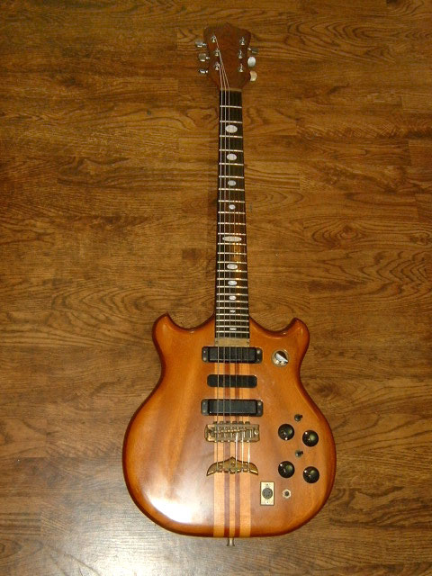 SagaさんのFAGは明かに特注品。最初のオーナーは関西方面のプロ・ギタリストだったとのこと。指板が良質なエボニーであるほか、ヘッド表裏の突き板はハカランダ、ボディ・トップ&バックはハワイアン・コアだろうか? Sagaさんから今回ご指摘いただいたのだが、他ページにある回路の解説には問題があった。当時のカタログから引用すると「ホーンタイプステレオアウトプットジャック:ホーンタイプのプラグを使用することの出来るステレオアウトプッジャック。このアウトプットはステレオになっているので、シールドコードはステレオタイプを使用してください。もし、モノラルコードを使用した場合、フロントP.U.のみしか音が出ません。また、このジャックを使用した場合は内蔵のバッテリーでプリアンプが作動します」となっている。Sagaさんご自身は、ステレオ−モノラル変換のアダプタを使っているとのことだ。 なお画像のギターでは、コントロール・ノブはアレンビック・タイプに交換され、テールピース位置を5ミリほど後退させるアレンジが施されている。 |
