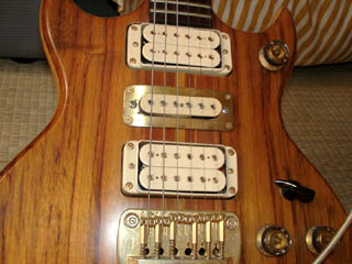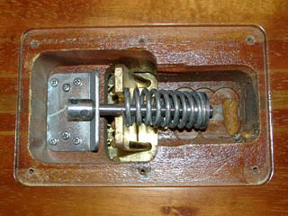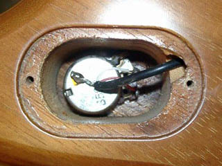 | 左はマスターボリュームのキャビティ。右はトレモロキャビティ。シンクロとは構造がちがうためバックパネルをあけることはなかったのですが、T.S.ビブラートって、こんなにごついんですね。 |