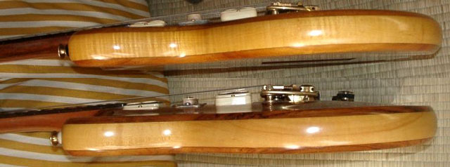 | バックはともにコアのようです。パネルは金属製。右がJのバック。こちらも同じ仕様です。フィニッシュはナチュラルのつや消しなのですが、頻繁に触る部分はつやがでています。ネックの裏やひじの当たる部分はピカピカです。 |