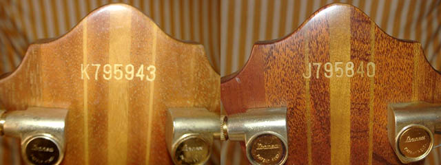| Kシリアルのヘッド(左)。一般的なGOlll1800仕様ですが、ロッドカバーのネジはゴールドカラー。Jシリアル(右)は黒です。イバニーズのパーロイドペグはボタンわきにトルク調整リングがついています。ナットもボディ側にブラスがラミネートされた凝った構成になっています。ロッドカバーに使われた木の材質は、Jシリアルの色が濃く質感がやや異なります。ロッドカバーは2プライになっていて、下側が色の白い部分はブラスで作られています。 |
