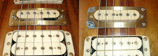 上がJシリアルの私のギター、下がKシリアルの兄のもの。トラは実際はもっと美しくでいてます。T.S.ビブラートはフローティングでネックの仕込み角が設定されているためボディに密着させることができません。センターピックアップはテープで巻いてあるだけです。エスカッションの形状やマウントの仕方(ボディに落とし込み加工している)など、かなり凝ったつくりになっています。 |