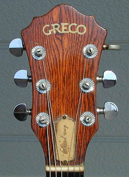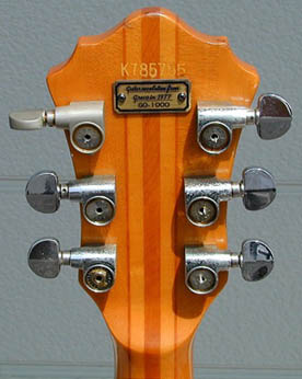 ペグにワッシャー交換と裏蓋1枚の欠品があるが、この点以外は標準的なGO1000前期型(1978年11月期出荷)。Vol.9カタログに写真掲載のギターよりも、こちらの方がずっと一般的に感じられる(違いはトグルSW周りのパーツカラー、アジャスター・カバー、ブリッジとテールピース間の距離)。メッキ部分の劣化とトップの引っ掻き傷はあるものの、アーチドトップで24フレットの仕様に満足しているそうだ。