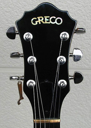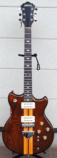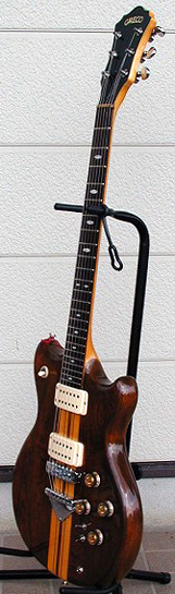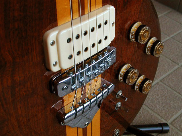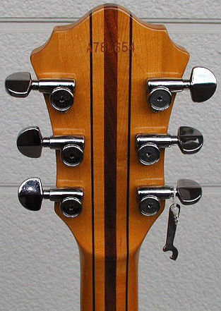 | GOでさらに初期の個体が発見された。これは地方のスペシャル・エージェント店に2003年まで在庫されていた新品扱いのギター。ブラックのヘッド・フェイス、ブラスナットという初期型の特徴に加え、ヘッド裏面のモデル名入り金属プレートがないのが目立つ。またダークステイン仕上げの塗装にも関わらず、金色のコントロール・ノブが取り付けられている。Vol.9カタログ掲載機では、ノブとボディ色の組み合わせに明確な規則性を見出せない。「GOの戸籍簿」から、ナチュラルのアクティブ・コントロール付きは「黒ノブ」と確認出来るので、この部分にあまり拘りがなかったのかもしれない。アジャスター・カバーが逆さまに取り付けられているのは、再装着時の間違いだろう。2つのミニSWに劣化があったため、販売店の手によって部品交換がされている。 |