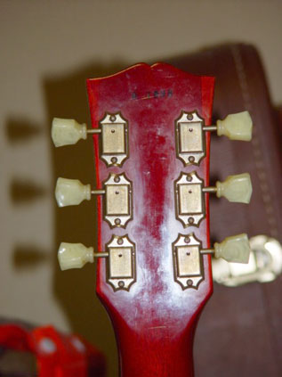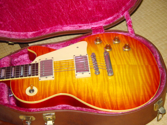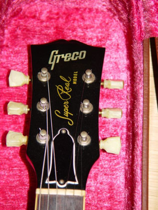 画像のギターは数年前にオークションで入手し、Riki_RC30さんが学生時代に欲しくても買えなかったギターを収集するきっかけとなった1本です。製造番号は「0 789×」で初期の仕様。ネック・ジョイントには丸棒が使用されています。ピックアップはZ−DRYで、音もかなり気に入っているとのこと。また、このギターは「グレコを応援するページ」で、オーナーshakeさんのギターや「みなさんのグレコ」コーナで「PonchanさんのEGF1200」として紹介されているものとトップの表情がほぼ同一です。トップが貼りなので木目/杢が酷似したギターが存在するのでしょう。あと何本の「兄弟」が存在するのかを考えると楽しくなってきますよね・・・。(2004年5月) |