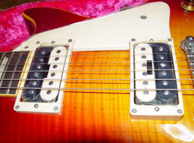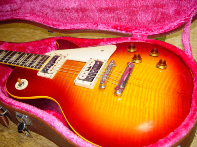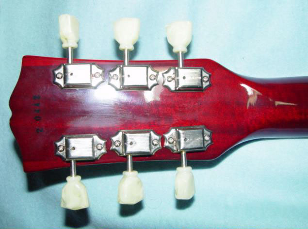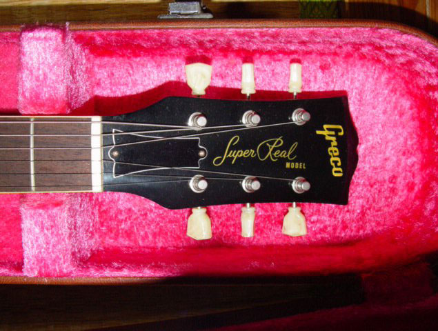 このギターも数年前オークションで入手しました 。製造番号は見づらいかもしれませんが「2 044×」です。1982年製なので、スーパーリアル期からミントコレクションへの移行時期の為、ヘッドにはスーパーリアルの文字が印刷されています。デッドストック状態で入手できましたので、まだピックアップやピックガードには保護用ビニールがついていて、本体に傷も無く良い状態のものです。ピックアップがオープンのゼブラなので、なかなか見た目も気に入っている1本です。いつか保護用ビニールをはずし実用にしたいと思うのですが、この状態も珍しいのでどうしようか悩んでいます。このギターも末永く大事に使用していきたいと考えています。(2004年5月) |