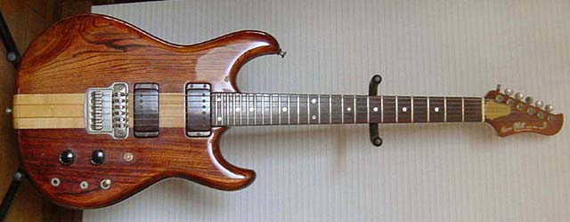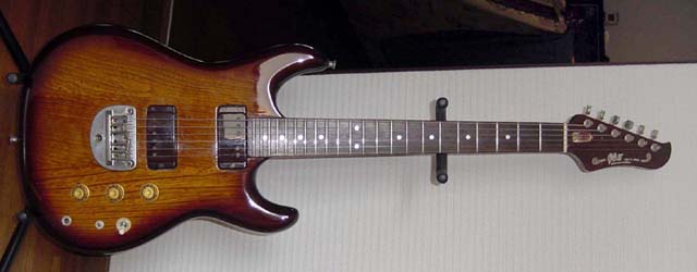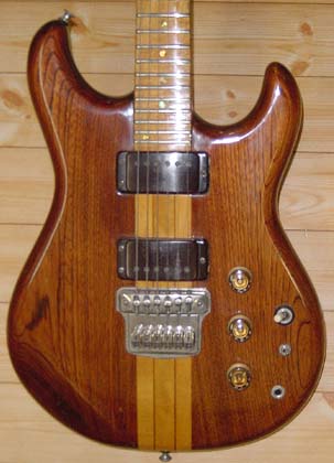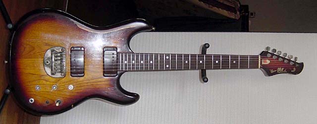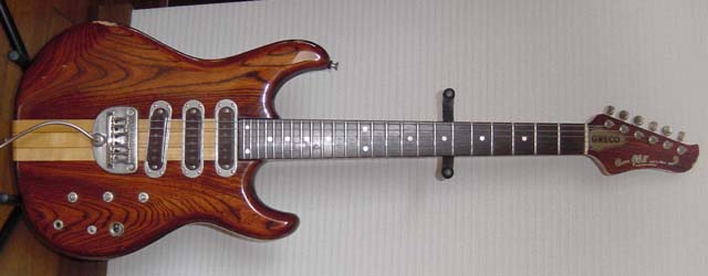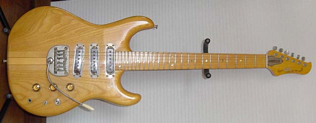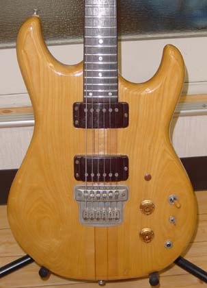 | 玉野さんのメイン・ギターは左上にあるGOll700N/M(J78)。オリジナルに対するこだわりはないとのことで、1ボリューム仕様に改造されている。このページの画像は他にも一部ノン・オリジナルの部分があることを付記しておく。これだけの数のGOllを弾きこまれた経験から、ネックや指板の形状については詳しく報告を下さった。'78年のノン・トレモロ機は全般にネックが薄い。これに対し'79年のGOll750/550では、幅はほぼ同じだが顕著にネックが厚い。またローズ指板はサイドのエッジが丸く、メイプル指板では相当に角張った印象がある。「I79」のGOll750DST/Rでは、明らかに指板のRがキツく、玉野さんの好みからは外れているとの内容である。GOllではビブラート・ユニットの変化で前期型/後期型が区別される傾向があったが、「F79」のGOll750NTではむしろフラット指板という印象があるので、GOllの進化は想像以上に多岐な展開があったと考えている。殆ど知られていない件になるが、初期型と判断されるGOllは後のものより2センチほども全長が短かったりする。ここまでの3本でも「L78」は改良型と見受けられる。1弦側カッタウェイとピックアップの感覚、6弦側ウイングとネックの接合位置に注目して欲しい。ネックが長くとられ、ハイポジションへのアクセス性が改善されている。 |