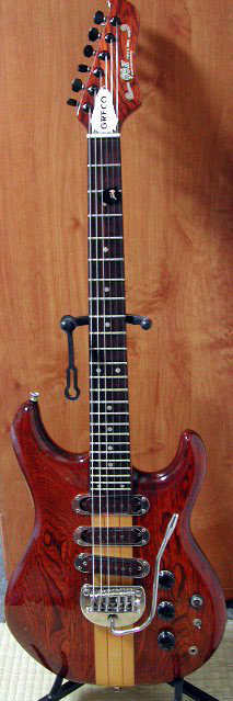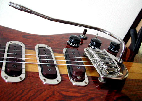 僕はGOシリーズの販売当時、GO、GOll、GOlllの中では実はGOllが一番嫌いでした。それがなぜか今になって不思議とGOllが好きになってしまい、ずーと探していました。それでついに念願叶ってオークションにてGETしました。実際に弾いてみて生音が大きいことにびっくりしました。またスルーネックのためサスティンがよく、音は僕好みの粘りのある音がします。ネックは若干太いのですが非常に弾きやすいギターです。若干、チューニングが不安定だったので、ペグをゴトー製のマグナムロックへ変更しました。アームは欠品だったために自作しました。あとはボリューム及びトーンのノブですが、ゴムがなくなっていたので写真のようにOリングを2本ずつ取り付けました。これでかなり操作しやすくなりました。 |