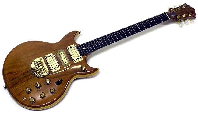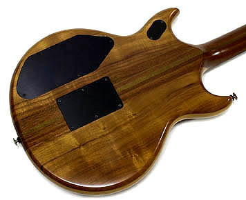 | ギターのスペックについては、ボディがハワイアンコア/メイプル/ハワイアンコアの3層ラミネート、ネックはマホガニーとウォルナットの7ピース・スルーネック。PUはハムバッカーがグレコSX−1、シングル・コイルはディマジオSDS−1を搭載している。指板はハカランダにメキシコ貝のインレイ。ヘッドロゴは落とし込まれた底が金色で独特のもの。ペグはイバニーズからの流用、ナットはラミネート・スタイルだ。重量は4.0kg(弦・アーム込み)。アジャスター・カバーは木(材不明)とブラスの2層貼り合わせになっている。 (→コントロール・キャビティを見る) |