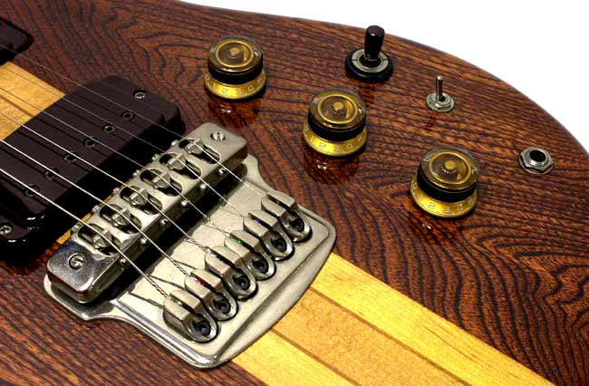 | 1978年9月期出荷のギターだが、一目見て分かるようにT.S.ビブラートを持たない特徴がある。この仕様についてもカタログ掲載があるので参考にしていただきたい。組み込まれているのはテンション・アジャスター・ブリッジというユニットだ。現物も数少なく、通巻番号のカタログに掲載がないので馴染みが薄いだろうか? 木部に目を向けるとボディはセン。ネックはメイプル/マホガニー、指板はローズウッドになっている。重量は弦を含んで4.1kgと計測した。 |