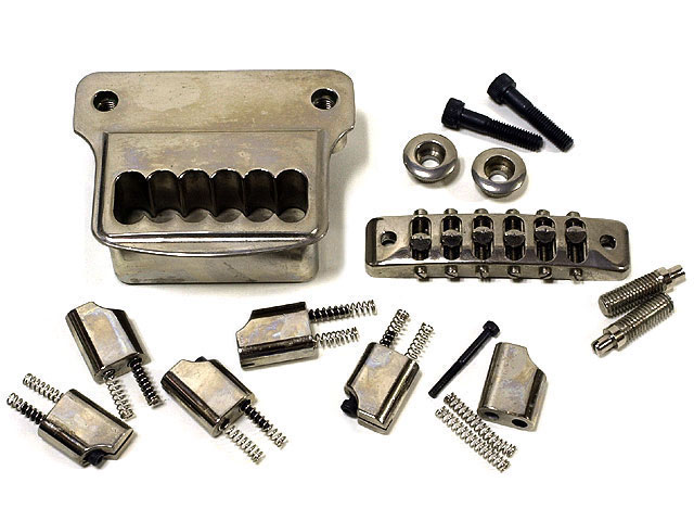 | 上の画像にはブリッジ/テールピース回りにある全ての金属部品が写っており、総重量は705グラムという信じられない数値に達する。「本体ブロック」だけで432グラム、ブリッジ(GO−DN)が89グラム、「テールピース駒」が1つで23グラムと計測した。GO前期型ではサスティーン・ブロックがお馴染みだったが、その狙いはテンション・アジャスター・ブリッジでさらに強力に意識されたのだろう。 |