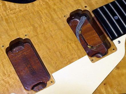 このギターはオーダーメードによる製作で、その証拠としてリア・ピックアップ・キャビティに「ORDER MADE」のスタンプが入れられています。私が入手したとき既に改造があり、ギブソン・ハムバッカー(HB−R/HB−T)を搭載していました。木部の掘削やネック・ジョイントについては、1985年当時の標準型と判断しています。画像ではフロント・トーンのノブを使ってプッシュ/プッシュで同時タップとなっていますが現在は回路をシンプルな構成に戻し、ベストマッチのピックアップを模索中です。