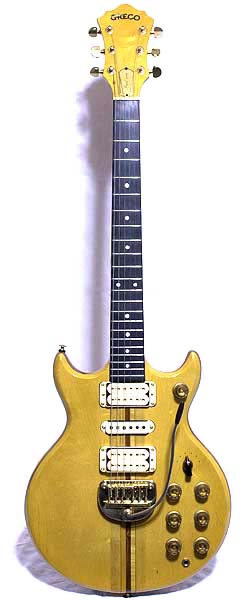 このギターの製造番号は「I79(1979年9月期出荷品)」。10月に開催された楽器フェアにおいて、「GOlllシリーズ」を発表する予定に合わせ生産されたものだろう。Vol.11カタログにはGOlllが3機種(1800、1500、1300)掲載されたが、写真には全てプロトタイプの特徴がある。すでに市場に出ていた「GOlll型」との混同もあり誤解されている場合が多いが、GOlll1300はVol.13カタログにある通りドット・ポジションマーカーが標準(掲載品はホワイトのボディ)。また、Vol.13のカタログは内容・表記に問題が多く読みこなすのが難しい。ボディはメイプル・アーチドトップ+マホガニーバックと紹介されているが、このクラスの実物で2層構造の個体は見たことがない。左の画像の一本も当然のようにメイプル/マホガニー/メイプルの3層構造を持っている。指板は「GOlll型」と異なり漆黒のエボニー製で、白蝶貝のインレイが使われている。カタログ仕様のGOlllは非常に珍しい物で、真っ黒な指板のGOlll1300はいつ見ても私自身新鮮な印象を受ける。ネックはご覧のようにメイプル/ウォルナットの7ピース・スピードウエイ、ピックアップは2機のSX−1とセンター用にPU−250の配置だ。ロータリーSWは「後期型」の配線となっている。重量については弦・アーム込みで4.1Kg。GOlllはノブ数が多いデザインの効果か非常に重そうに見えるが、実際には1978年のGOシリーズより大幅に軽くなっている。GOシリーズにもウエストコンター加工の追加があったことから、一時期のモデルがあまりに重すぎた反省があったはずだ。外見上の変化とトレモロの追加に留まらず、「軽量」が開発コンセプトにあったのは間違いないだろう。ごく小さな変化だが、ロータリーSWの軸まわりについて木部加工の変化があったことも書き加えておく。これ以前の「GOlll型」では、ロータリーSWを固定するナットがアーチ部分を直接締めていたが、このギターからは底部が平面になるザグリを追加されている。些細な変化だが、こんなところからもレギュラー・モデルに昇格した気配が感じられよう。(画像のアームは他機からの流用) |