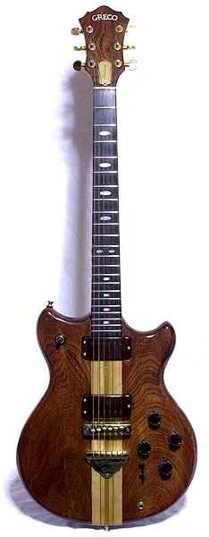 H79(1979年8月期出荷)のGO900後期型。後期型GOにおいては、全グレードで、アーチドトップ・ボディ、22フレット仕様ネック、チョコレート色カバーのPU−3DSピックアップが採用された。Vol.10カタログにはGO1400として、前期型仕様にT.S.ビブラートをつけたギター(24フレットのネック、アイボリーカラーのPU−3Dピックアップ搭載)が掲載されたが、これは相当に少数しか販売されなかったようだ(PU−3DS、24フレットのT.S.ビブラート仕様もある)。後期型では、まず900と700の2グレードに整理された後、1000が追加発売された。900はゴールドパーツ、シングルサウンドSW×2(前期型の下側SWはリア用フェイズ)、7ピース・スピードウェイネックとされ、これに対し700はクロームパーツ、5ピースネックだったので容易に区別が付く。セン/セン/センの3層ラミネートボディ、ローズ指板(オーバルインレイ=900のみ白蝶貝)、ネックの材質などは共通だった。しかしGO1000はかなり異なる質感のものとなって登場し、ウォルナット/マホガニー/ウォルナットのツヤ消し塗装ボディで、ブリッジとテールピースがGO系ではないもの(部品番号としてはBR−GO10など)がつけられた特色がある。またこのころのGOシリーズを思うとき、富士ローランドのギターシンセサイザー・コントローラーG808、G303の存在を忘れることができないだろう。なおPU−3DSピックアップには面白い特徴があり、コイルタップ時にパワーを失わないことが謳われていた。ハムバッキング時には4900+4900の9800ターンが使用される。シングルSWをONにすると4900+1900の6800ターンのコイルからの出力が得られ、シリコンによるノイズカットと相まって幅広い音作りが可能と紹介されていた。なおプラス・アルファの巻き線を持つのは、6角ポールピースが露出した側のコイルで、他方はアイアンバータイプのポールピースを持っている。機能切替に使われるミニSWは、時期により2種類がある。当初は前期型同様の「ピン・タイプ」でニッケル・メッキのものが使用され、途中から角型で黒い部品にかわった。なお、重量については4.0Kg(弦込み)と報告しておく。 |