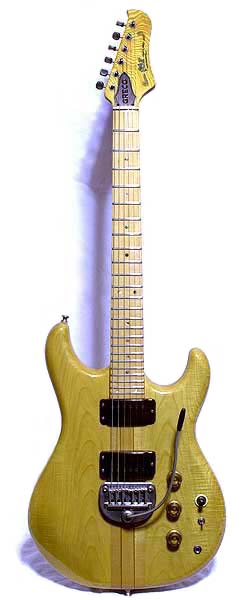 製造番号「F79(1979年6月期出荷)」のGOll700NT。最後の「T」については記載すべきか微妙なところだが、ある時期ではモデル名が「N」で終わればナチュラル・ボディ+テンション・アジャスター・ブリッジ仕様(かなり数が少ない模様)。「NT」の方がT.S.ビブラート仕様と明確に区別されていた。カラーについてはDS(ダークステイン)とナチュラルが良く知られているが、カタログ上にV(バイオリン)、RS(レッドサンバースト=スルーネック部にもバーストが吹かれている)などの設定もあった。各色にローズ指板・メイプル指板が組み合わされ、ブリッジの変化も含めると結構多彩な印象を残したギターと言えるだろう。基本仕様としてボディはセン単板、ネックはメイプル/マホガニーの5Pスルーネック(ヘッドアングルつき)、ナットはラミネート構造。ペグはMH−S8、ピックアップはPU−3Dで、2VOL.1TONEに加え、フロント用のパラレル/シリーズ切替えSWのコントロール。インレイはメキシコアワビ、金属パーツはニッケルメッキとなっている。ビブラートアームのグリップ部については、ごく当初には金属製、その後はチョコレート色。アイボリー色の物が作られるのはGOlllの時代になってからだ(GOllには無い)。T.S.ビブラート本体についても初期はブラス製なのだが、後には亜鉛合金系になったと聞く。以下に使用上の注意点をいくつか書いておく。まずはコントロールノブのゴム製グリップ、トグルSWのクッションラバー(白の方だけ)が大変に劣化しやすいこと。ひょっとすると使用するポリッシュを選ぶのかも知れない。次に、ブリッジの高さ(弦高)を調整するときにマイナスドライバーだけを用いると、ポスト上部が簡単に欠けてしまう。注意してみるとブリッジポストの中程に貫通穴があいているので、こちらも併せて使うべき設計のようだ。この個体についてはセンにピンストライプ状の杢が多数現れている。重量を量ってみると4.0Kg(弦・アーム込み)だった。GOllシリーズのネックは、国産ギターとして異例に太い。このことは中古市場における低評価の一因となっているのかもしれない。外観から誤解されている場合が多いが、このギターはいわゆる「ギブソン・ミディアム・スケール」なのを加えておく。 |