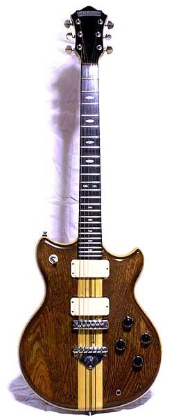 1977年に製作されたGO700クラスのプロトタイプ。同年10月東京・科学技術館で開催された楽器フェアに、GO−A1として展示されたギターそのものだ。このことは、イベントレポート掲載がある業界誌で確認できた。写真はあまり鮮明なものでなかったが、ブリッジ下スルーネック・メイプル部にある「シミ」から同一の個体と判断している。セン/メイプル/センのフラット・トップ・ボディは、市販モデルとは大幅に構成が異なる(市販品ではセン/マホガニー/セン)。また、各層の接着に褐色の突き板が挟み込まれ、実際には5層からなっているのが確認できる。通常のGO700が5ピースのスルーネックなのに対し、こちらでは7ピースなのにも注目願いたい(指板はローズ、総重量4.5Kg)。木部の着色に目を向けると、一般のものより色がかなり淡いようだ。画像からは確認できないが、700のベースとなるものなのでウエスト・コンターは入れられていない。ブラックのヘッドフェイス、ブラックのアジャストカバー、ブラスナットについてはごく初期型の市販品と共通だが、サスティーン・プレート付きブリッジ(サドルについても少々特徴がある)、ポールピースの露出しないフルカバード・ピックアップカバー(実際には画像よりかなり濃いアイボリー色)、金属プレートを用いたブランドロゴ、ハイフレットでのインレイの配置などにプロトタイプの特徴がある。微妙な差でしかないがよく見ると、ペグもMH900Cとは若干異なる形状をしている。ヘッド裏面には製造番号を見つけられず、ブラス製のプレートが表側のロゴ・プレートとでヘッドを挟む状態に2カ所ビス止めされている。ネームプレートと呼ぶべき存在なのだが、肝心のモデル名の場所は空欄となっている。完成時にまだモデル名が決定しなかったと考えるのが自然だろう。表裏の金属プレートを取り外すと、ペグシャフトほどの穴が2つ出現するのには驚かされる。1977年の楽器フェアではグレコからコピーモデルが一本も出展されなかったとの記録がある。40本を越すオリジナルデザインのギター、ベースが出展され、左右対象型ヘッドを持つものの多くがメタル・ロゴを与えられていた。MR後期型最初の雑誌広告にもこのメタルプレートが確認できる。スピードウェイをイメージしたランボルギーニ・イオタ型ギター、ポルシェ・ターボ型ベースも同じ会場に展示されたが、やはり同じ形式のブランドロゴだった。 |