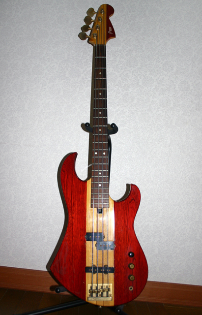 RAYさんが2006年ごろ手に入れた珍しいベース。製造番号は「1 206x」で1981年製のようだ。Player1982年1月号掲載の広告から、イシバシオリジナルProject K824というモデルであることが判明した。広告によれば当時の定価は8万円。ダークステイン(DS)、マットダークステイン(MDS)、チェリーワイン(CW)、ブラック(B)、メタリックレッド(MR)の5色が販売されていた。写真のベースはチェリーワイン(CW)であろう。ヘッドフェイスは曲面に仕上げられ、ウィングも外側になるほど薄くなっていたりと、なかなか凝った作りになっている。 |