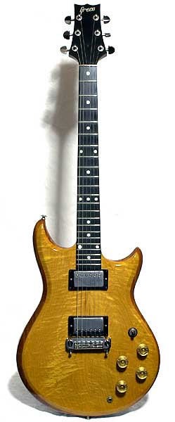表題に敢えて「ショーモデル」という言葉を選んだのは、このギターがニューモデル開発目的のプロトタイプではないと分かっているからだ。現在は千葉県船橋市でギターラブを主催するクラフトマンが、富士弦の開発部門に社員として所属していたときの作品である。デザインの流れとしては個人性が強く、入社以前に製作したギターのリニューアル版と言った様子だ(ギター・グラフィックVol.2、P61参照)。このギターは2本組作品中の1本であり、残る相棒の方は当時の刊行物「The 楽器'82・83(立東社)」に姿を見ることが出来る。上司から「何か出展してみないか?」と声をかけられ、以前のデザインを発展させ製作したとのことである。この頃、Grecoロゴを持つギターは、全てが神田商会に納入されると言うルールがあったという。製作者は展示後のギターの行方を、ギター・グラフィックVol.5の「Greco特集」まで知らなかったそうだ。一方、1983年のARBアッパーカット・コンサート(後楽園ホール)のレポート写真にこのギターの姿が見られるので、比較的早い段階で田中一郎氏の手元に渡ったことが分かる。後楽園ホールに搬入された時点では、メタルエスカッション、ボディ・トップへシルバーのストライプ追加など若干の改造を受けていたが、独特の形状からすぐにこのギターであると確認できる。外観がPRSに似ていると感じる方が多いことだろうが、1981年のPRSは左右対称のカッタウェイを持つサンタナ・タイプしか存在せず、左右非対称のものが発表されたのは1984年である。仕様に触れるとメイプル3Pネックでエボニー指板。ボディとの接合に特徴があり、ヒールレスの完全なスムース・ジョイントとなっている。フィギュアド・メイプル・トップ/マホガニー・バックのボディは、相当な薄型であるにもかかわらず、非常に凝った3次元構成が特徴だ。Player誌(1998年12月号P320)にある通り、フレットはかなり太めなのだが、コンパクト軽量で取り回しが良いギターになっている。ナット位置でのネック幅が41ミリと、やや細めになっていることも見逃せないだろう。重量は3.6Kg(弦を含む)で、スケールはいわゆるギブソンのミディアムだ。Player誌のインタビューで発言があったとおり、その直後に田中氏の元を離れた。同氏の判断としては「木の反応は抜群だが、バダス・ブリッジがイマイチと思った時期があり手放した」とのことだ。