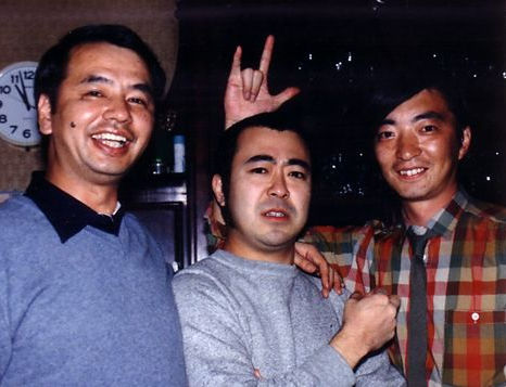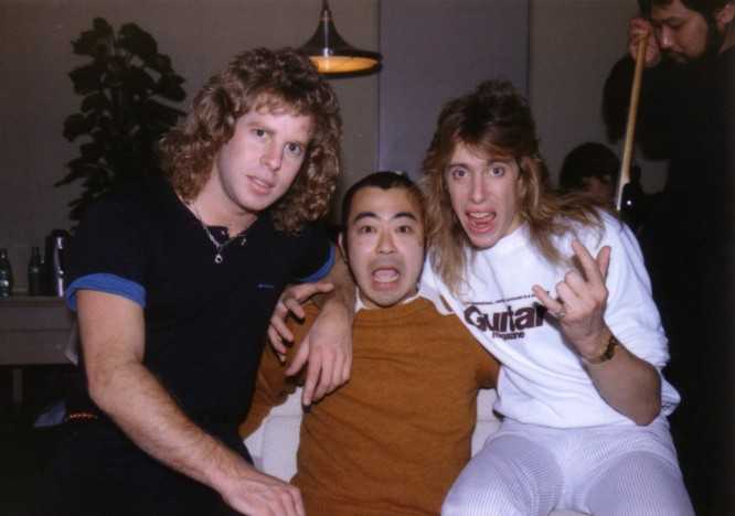 Night Rangerのブラッド・ギルズ(左)、ジェフ・ワトソン(右)と成毛(中央)。('83年12月)