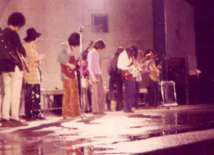 第1回10円コンサートで、楽屋へ覗きに来ていた者もみんな参加したアンコール・セッション。ステージも1200人の観客も雨でずぶ濡れになったが、「気分はウッドストック」で、却って盛り上がった。(左端は山口冨士夫)
